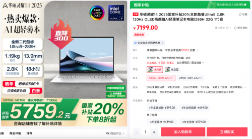 华硕灵耀14 2025集酷睿Ultra强劲性能、超长续航、AI体验、专业级好屏于一身,机身超轻薄有质感,是不可多得的高效移动办公利器。目前正值618大促,购机可享白条6期免息、晒单返50元E卡等多项福利,不分地区用户还可叠加至高20%国家补贴,补贴后入手仅5759元,助力高效办公,让你轻装上阵。