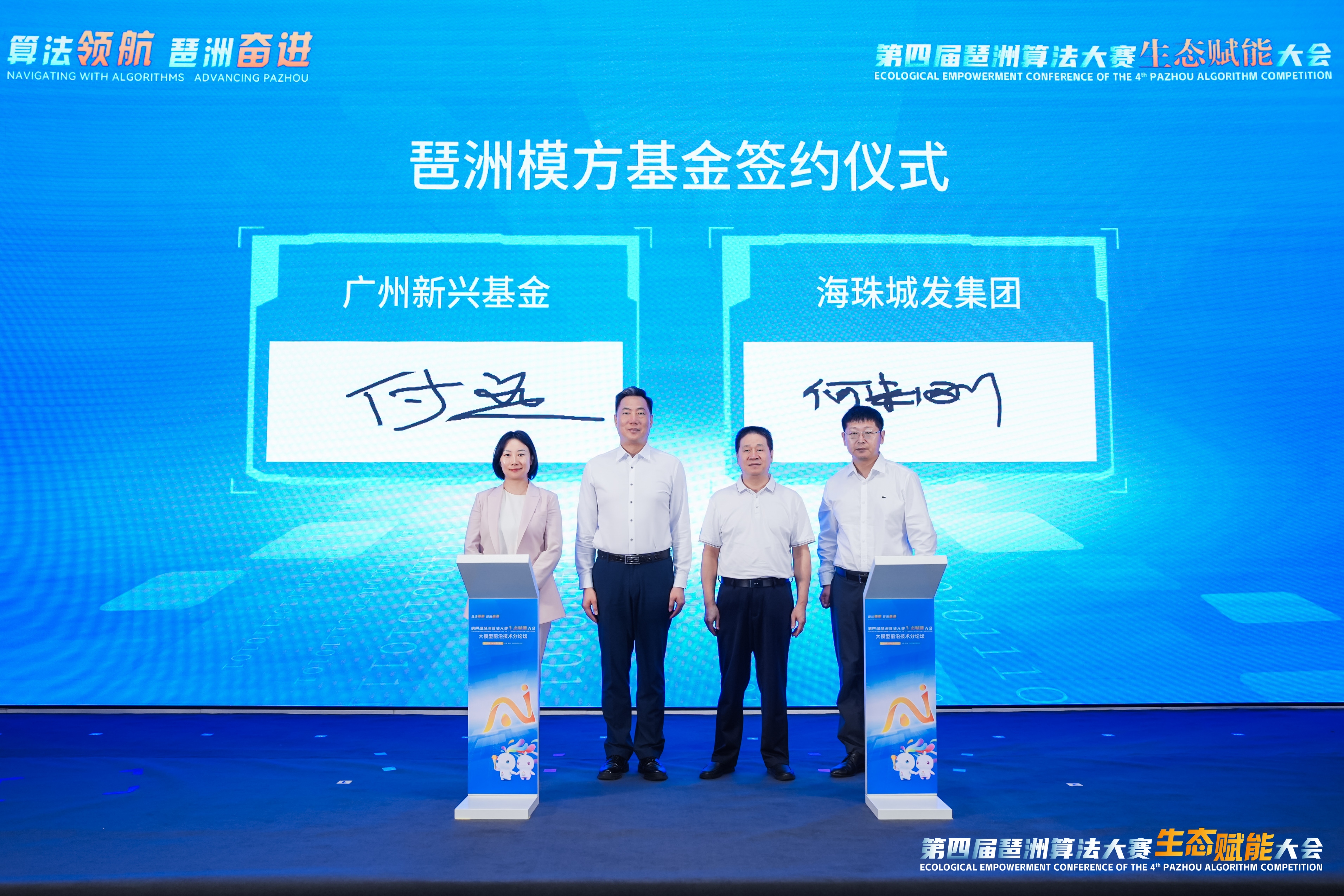 在广州市工业和信息化局一级调研员史春风与广州市海珠区委常委、常务副区长陈伟锋的共同见证下,广州基金助理总经理、广州新兴基金董事长付燕与海珠城发集团董事长何来刚正式签署了琶洲模方基金合作协议。