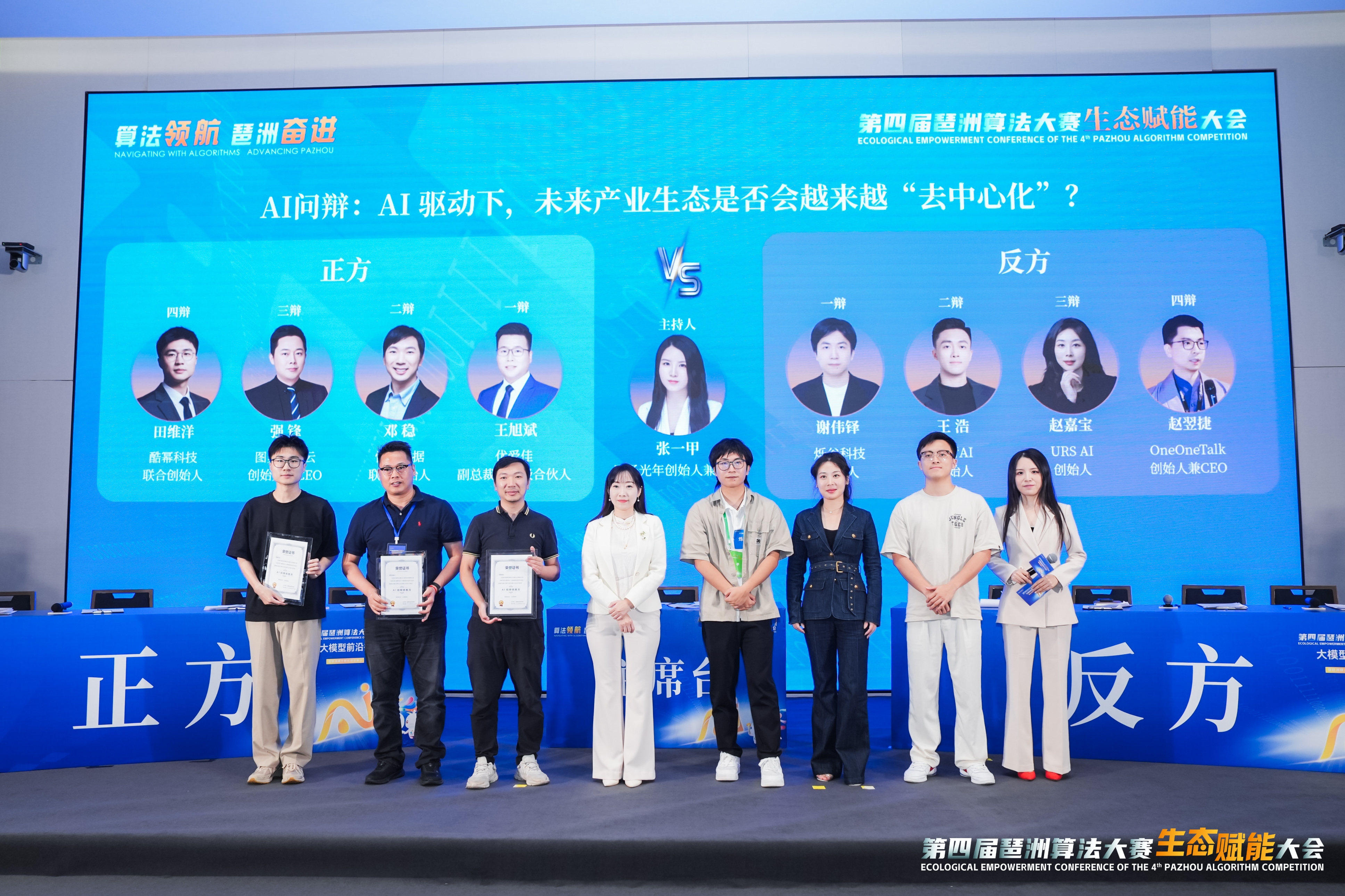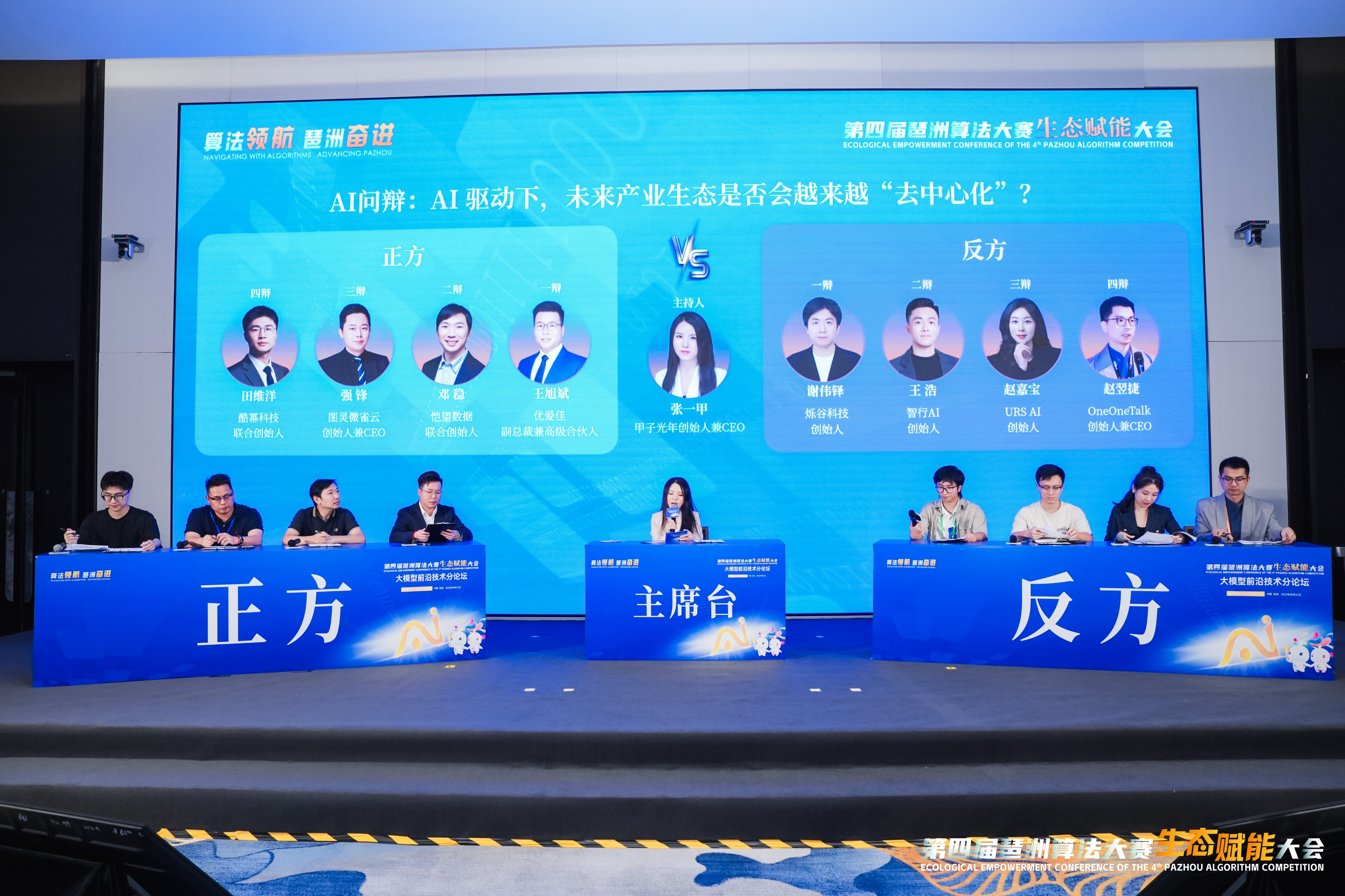 本次论坛以一场精彩的“AI问辩”作为压轴环节,将现场气氛推向了高潮。辩论环节由甲子光年创始人、CEO张一甲主持。辩论双方汇集了来自琶洲模方不同赛道的八位创始人,围绕“AI驱动下,未来产业生态是否会越来越去中心化?”这一核心议题展开了激烈交锋。